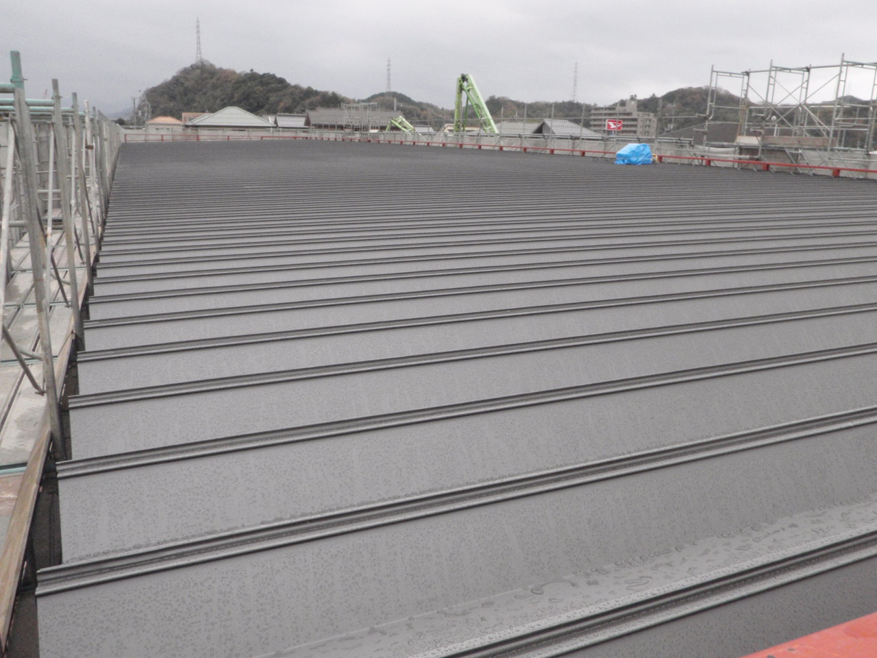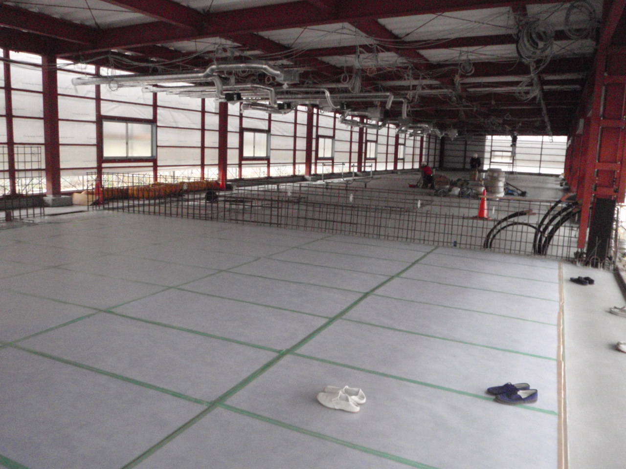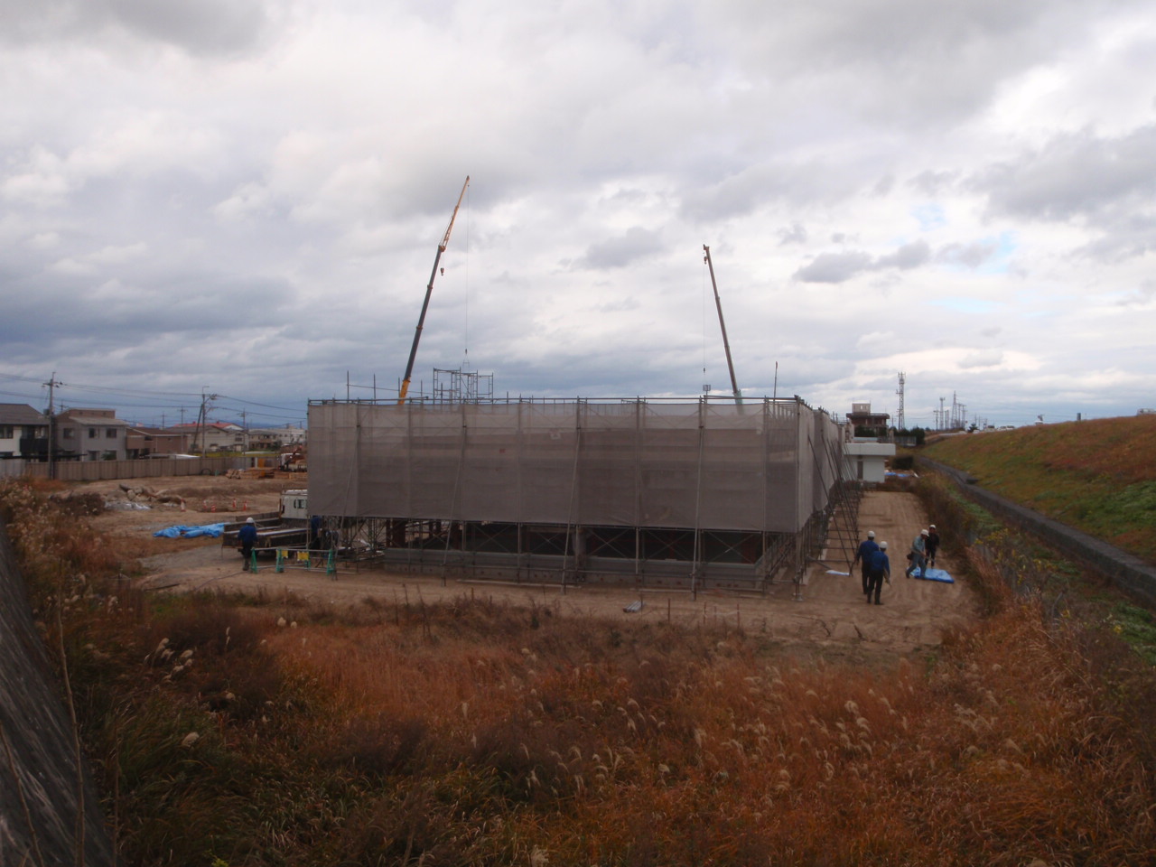 前回から1ヶ月たちました。資材倉庫棟方は土間コンクリート、屋根工事まで進んでいます。