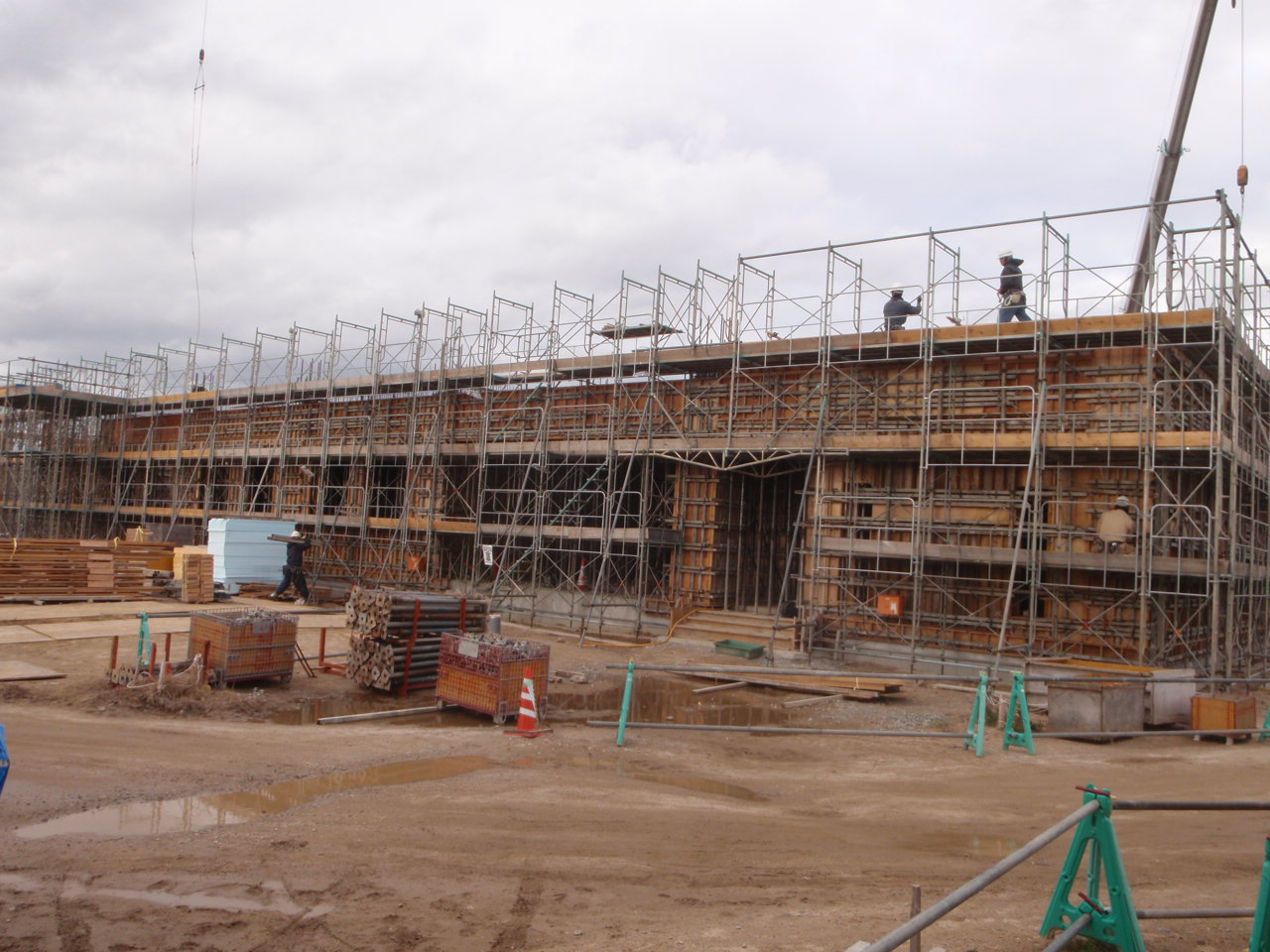 庁舎棟の方は1階躯体コンクリート打設に向け型枠、鉄筋工事中です。