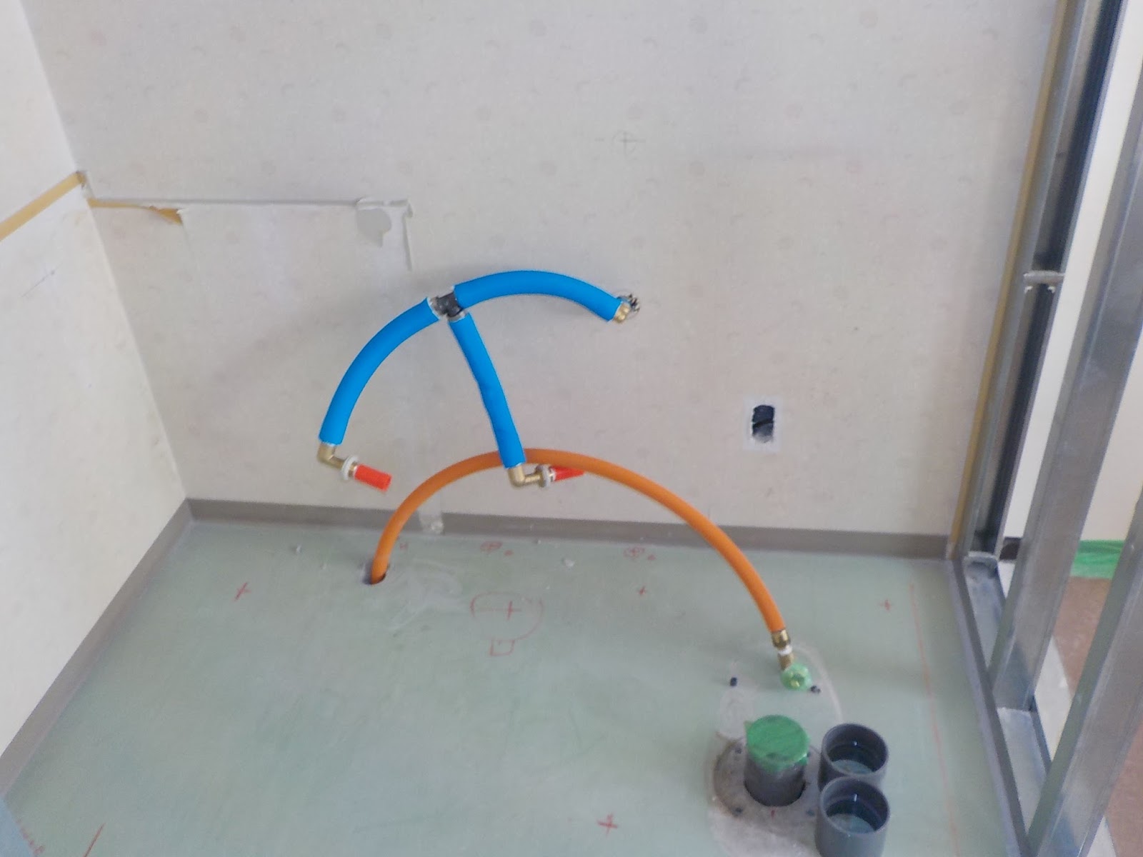 | 部屋内の給水管(青)と給湯管(橙)と排水管(灰)の状況です。 |