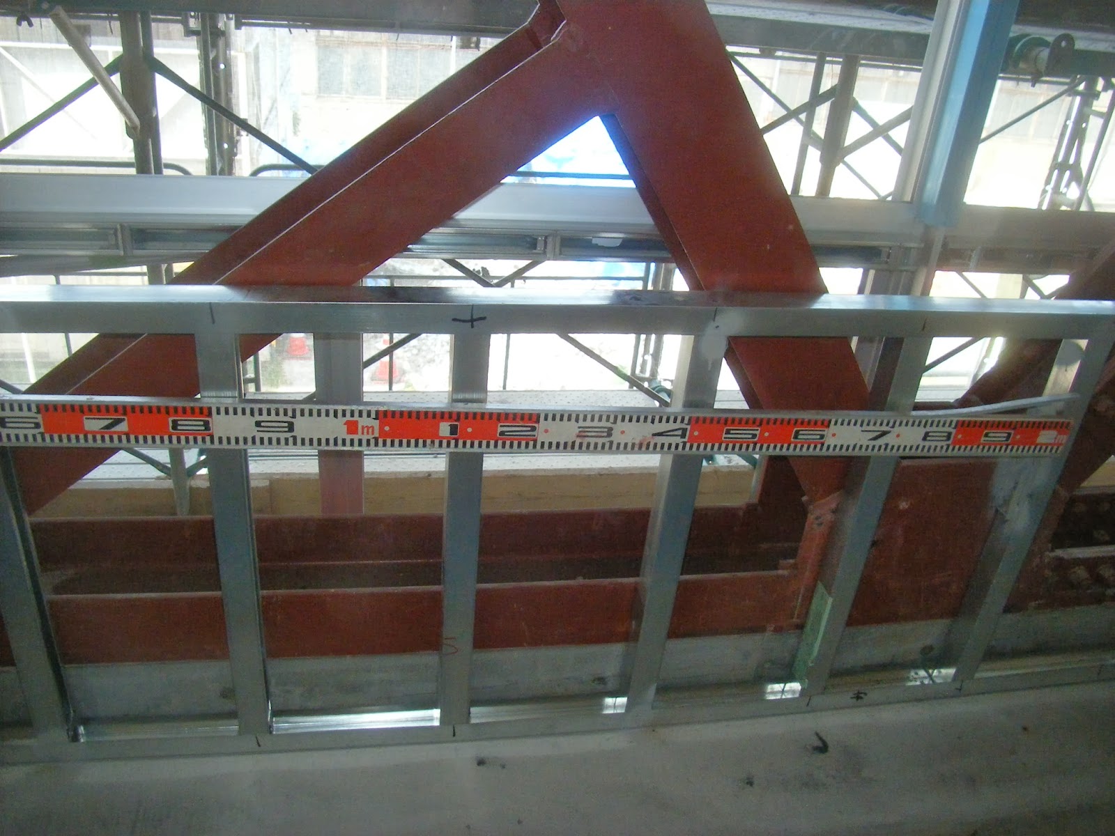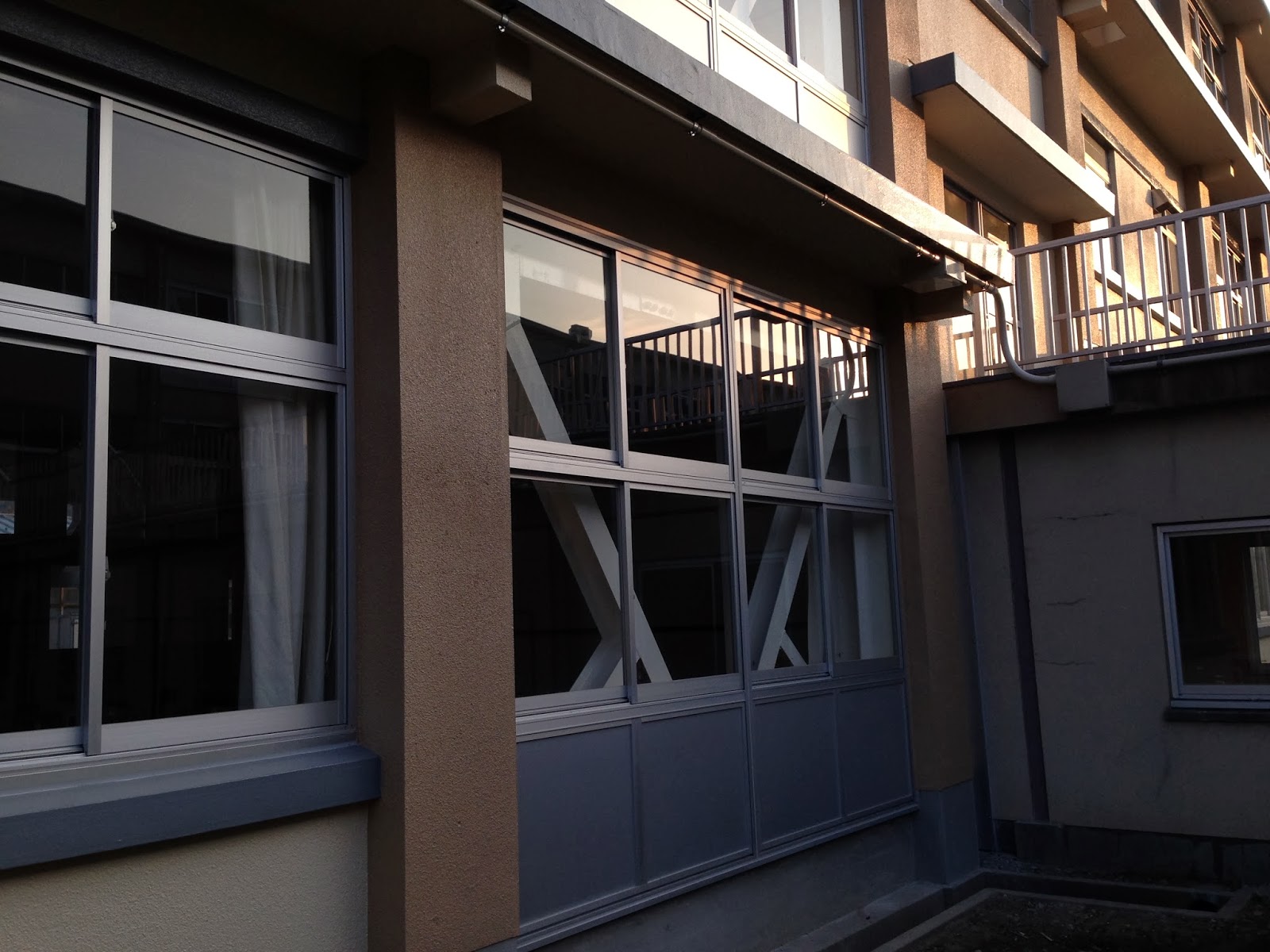 鉄骨を取り付けた後、外部には新たなサッシを、内部には写真のように腰壁の下地を組み立ててこの上に仕上材を張り付け、塗装などを施して完了です。