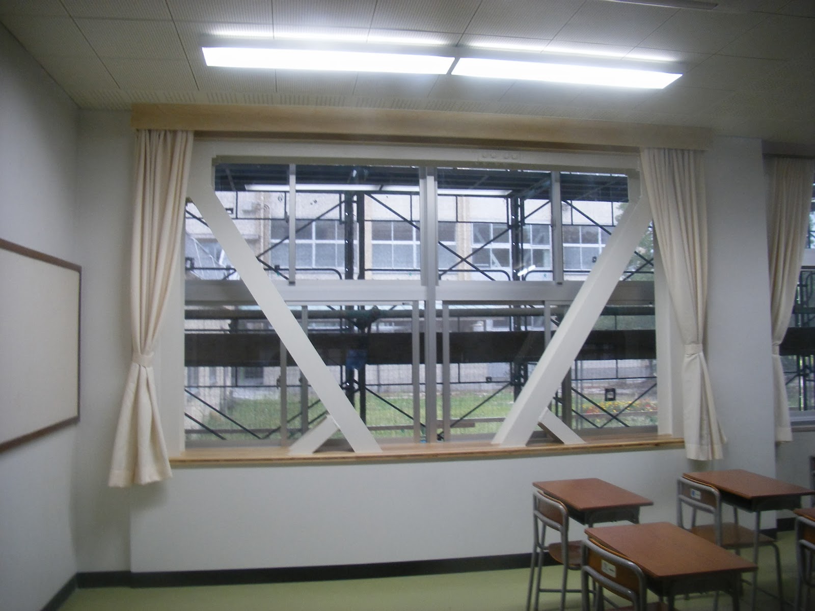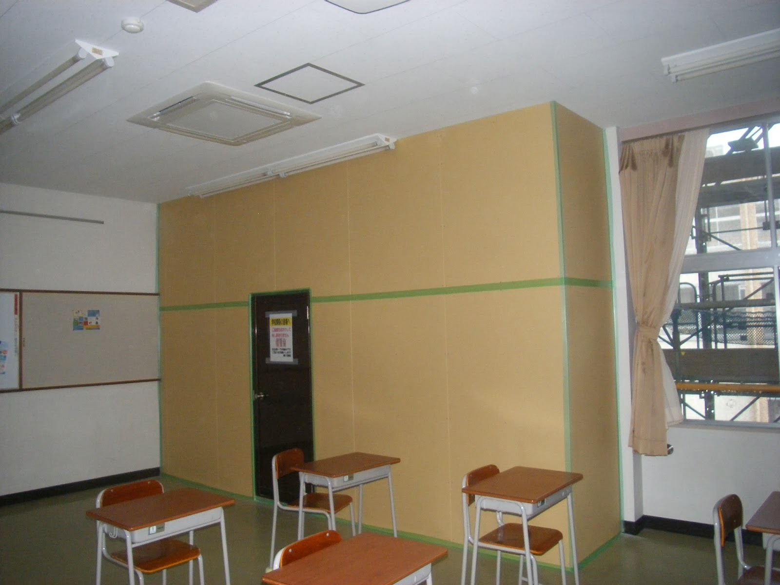 教室棟の内部に鉄骨を取り付ける工事のため、5月から内部に仮設の間仕切りを設置し、安全に作業ができるようにしました。