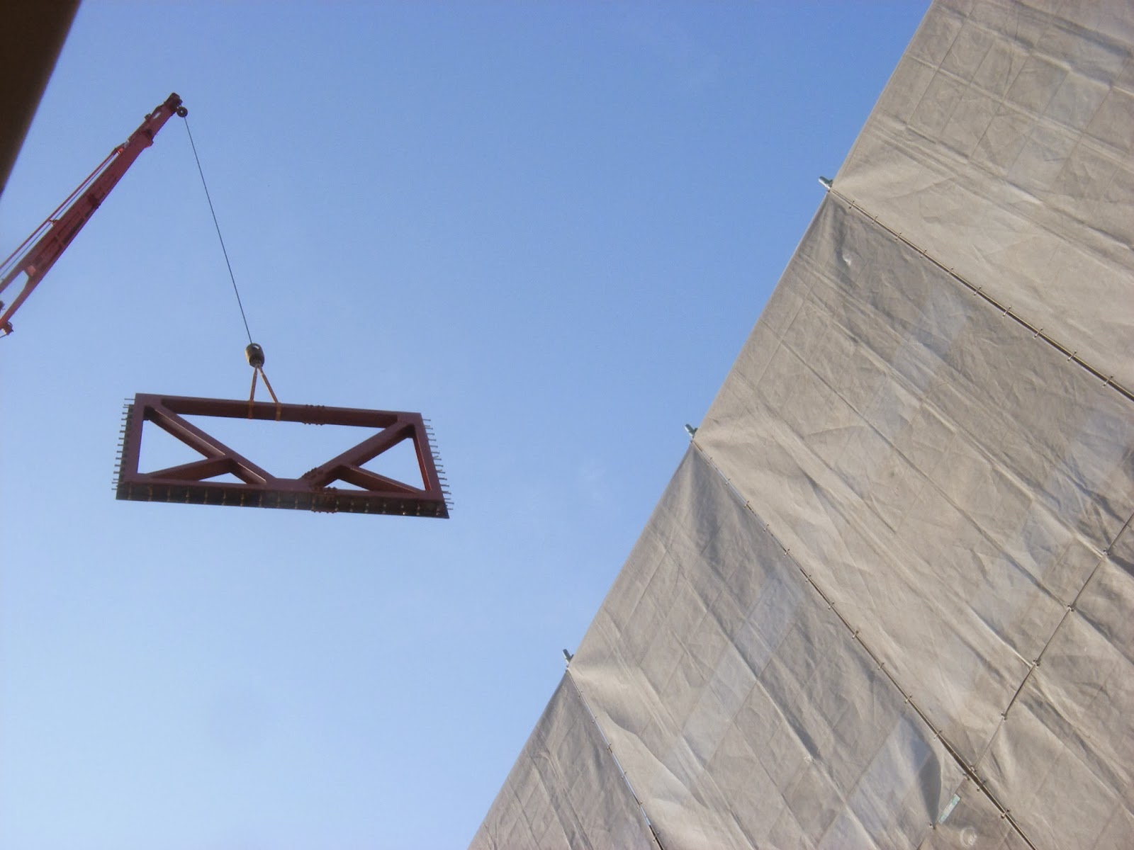 解体して出来た大きな開口部に鉄骨をクレーンで吊って組み立てます。