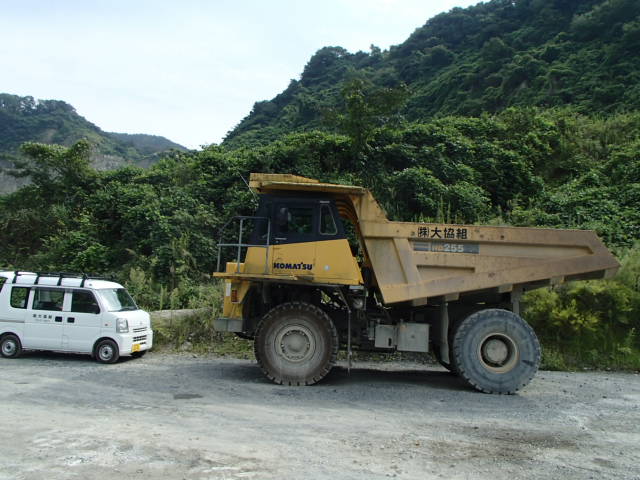 タイヤ交換が大変だろうな~。ダンプ自体も大きいですが、これに原石を積むと重量が50tを超