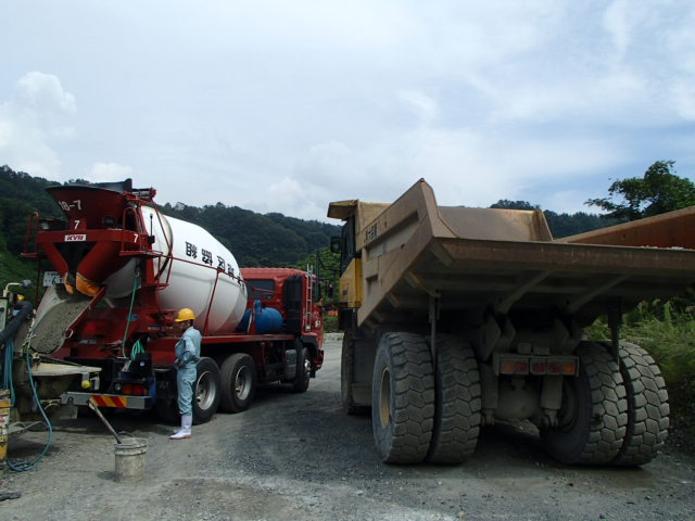 生コン車のタイヤが、かわいらしく感じられます。直径は1.5m程ありまして、重量はいかほどか、