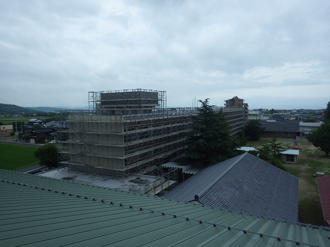 | 屋内運動場側の屋根からの風景です。 屋内運動場も全面改修なので、 まだ足場組の途中です。 |