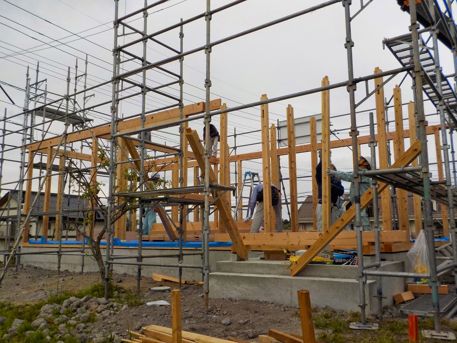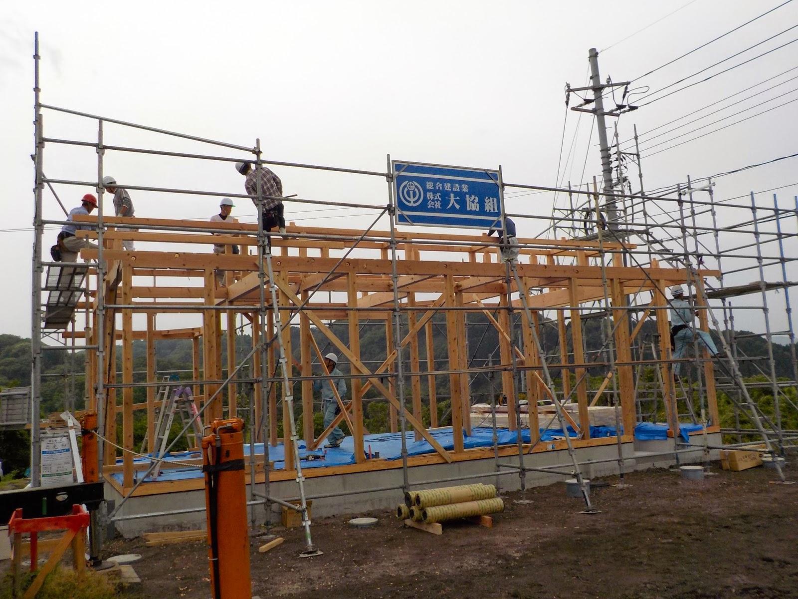 現在外部は 瓦敷きも終わり外壁サイディング張を施工中。