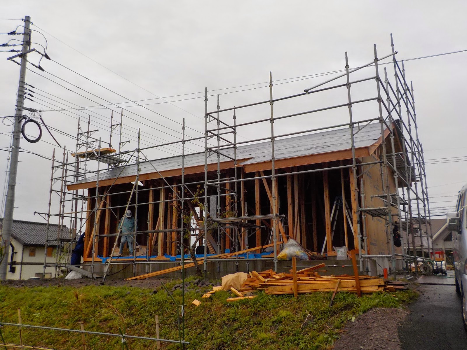 途中降り出した雨も 夕方にはあがり無事屋根仕舞、耐力壁も
