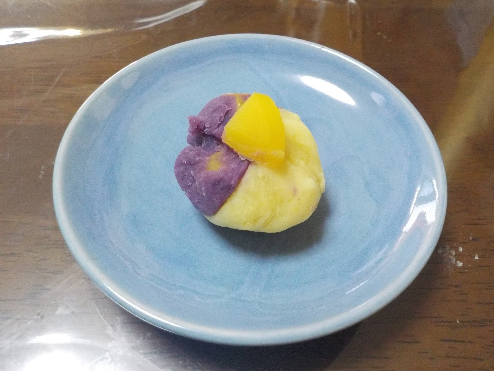 どちらも蒸して 別々に潰します(自家用なので裏ごしなし)少しの砂糖、栗の甘煮を刻み
