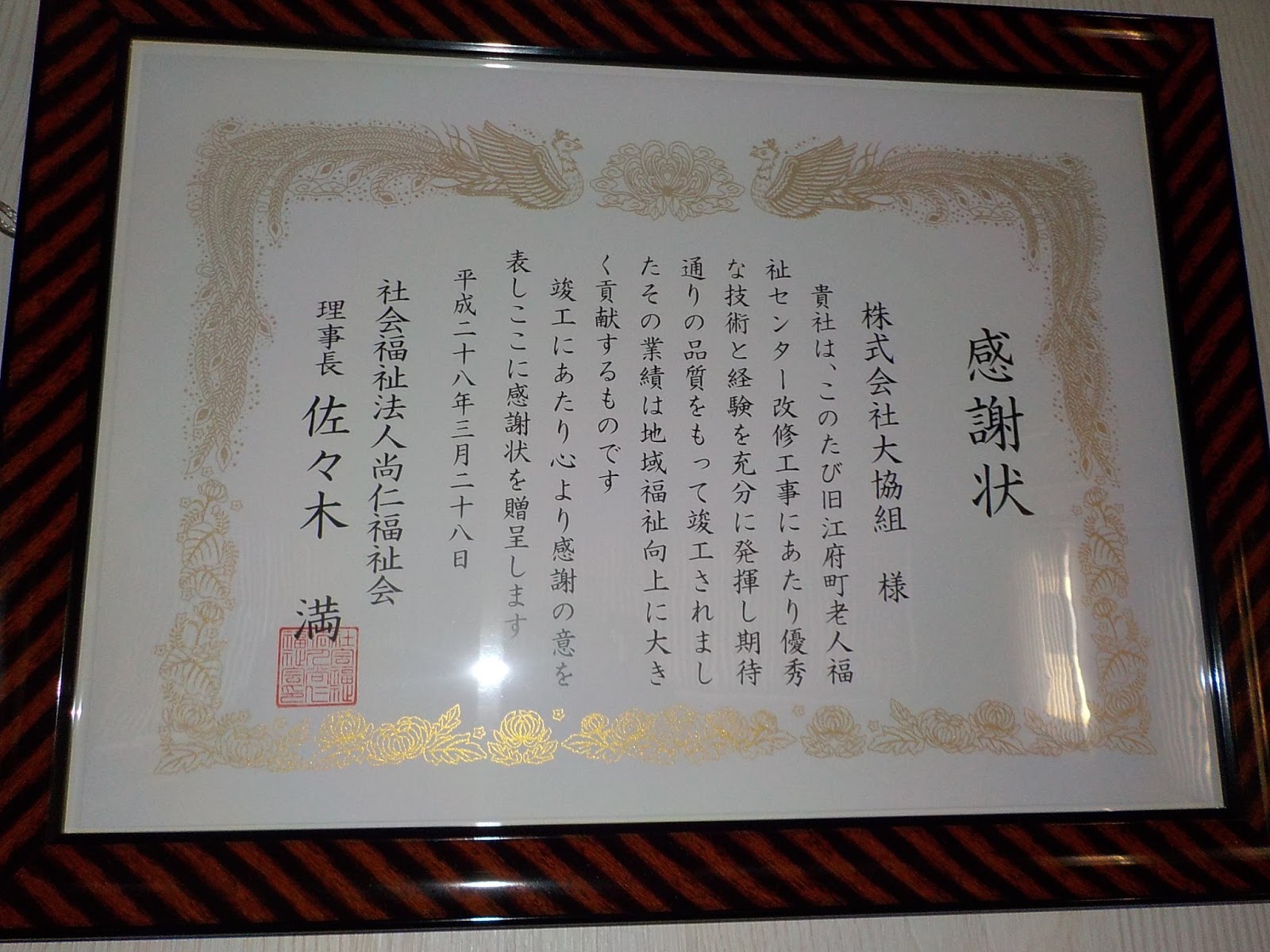 | 施工主である社会福祉法人尚仁福祉会の佐々木満理事長様より感謝状を頂きました。 |