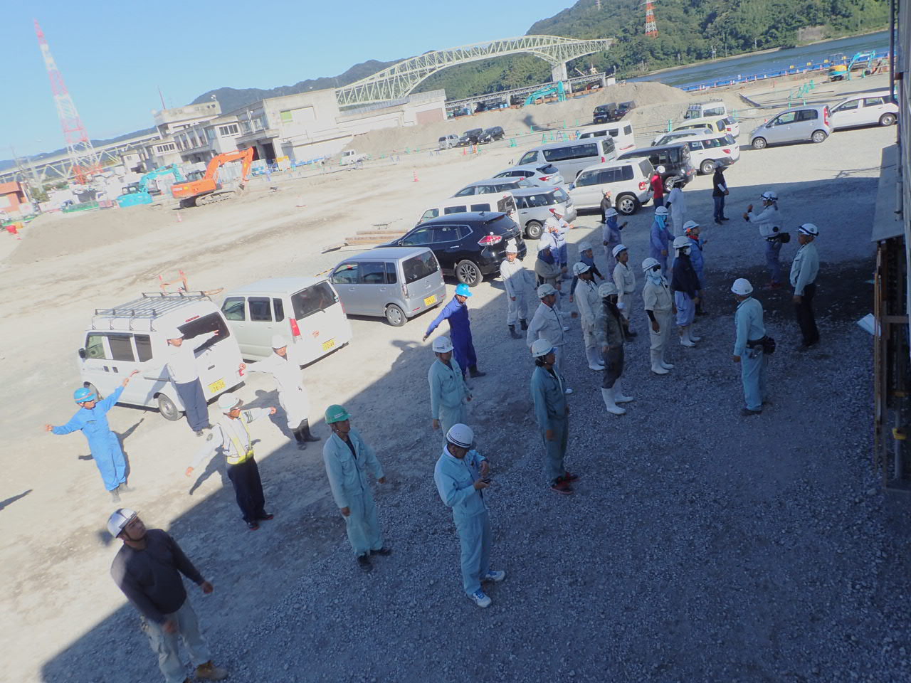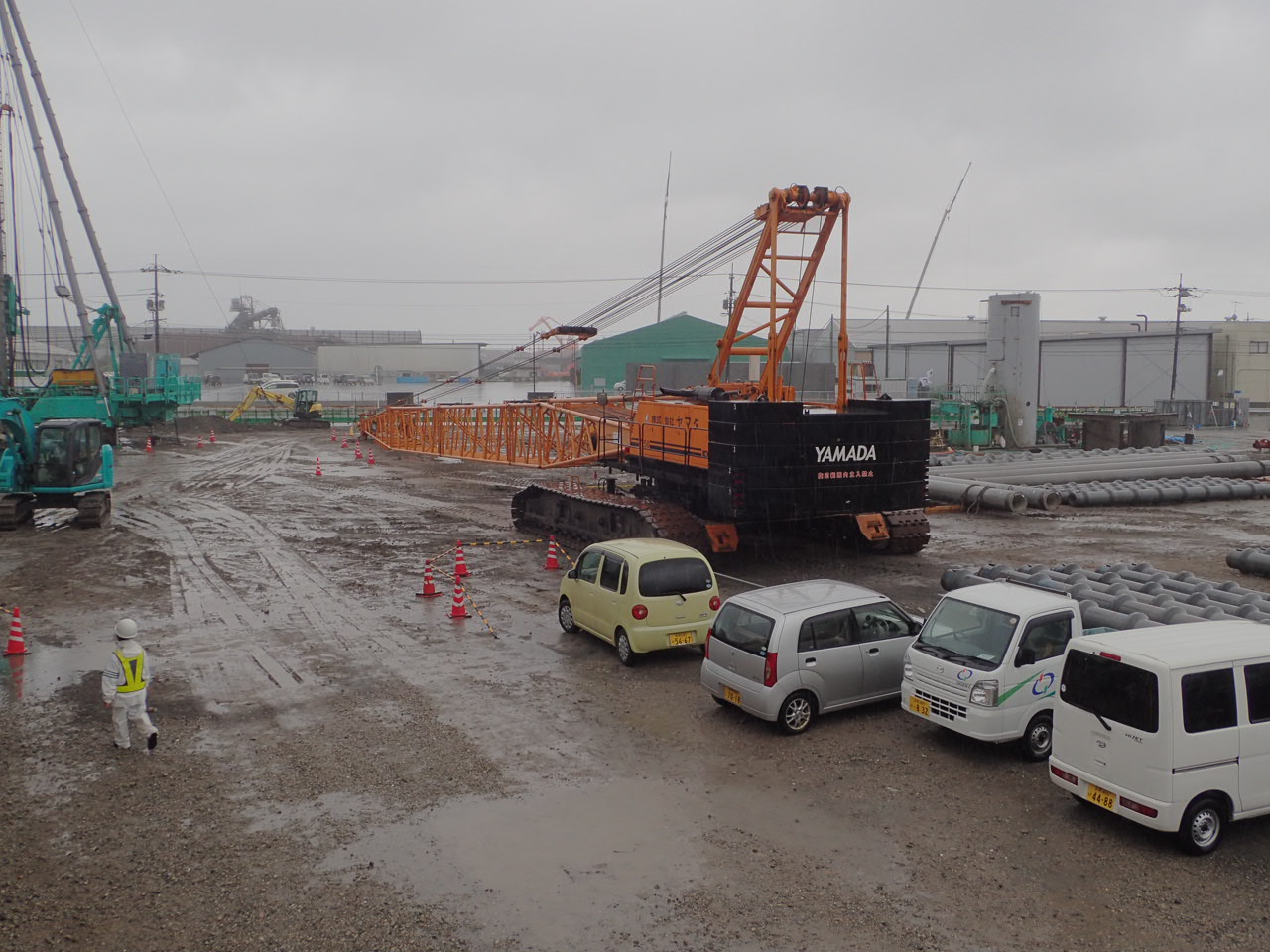 | 昨日までは晴天でしたが 台風が来るので クローラークレーンは ブームを倒しています。 |