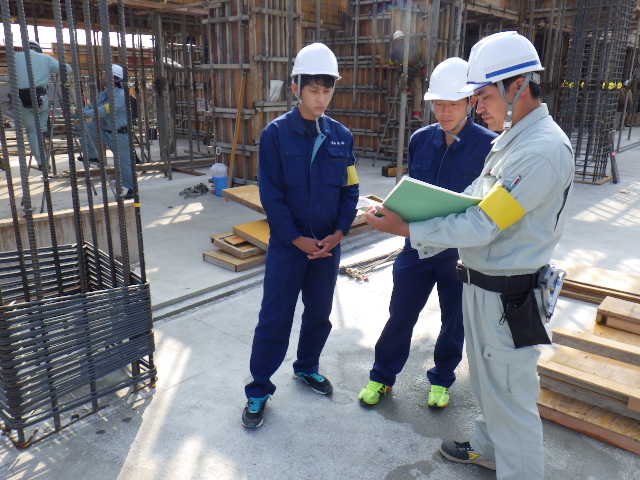 | 東高の現場で門脇さんに鉄筋・型枠組立作業の作業状況を見学したり |