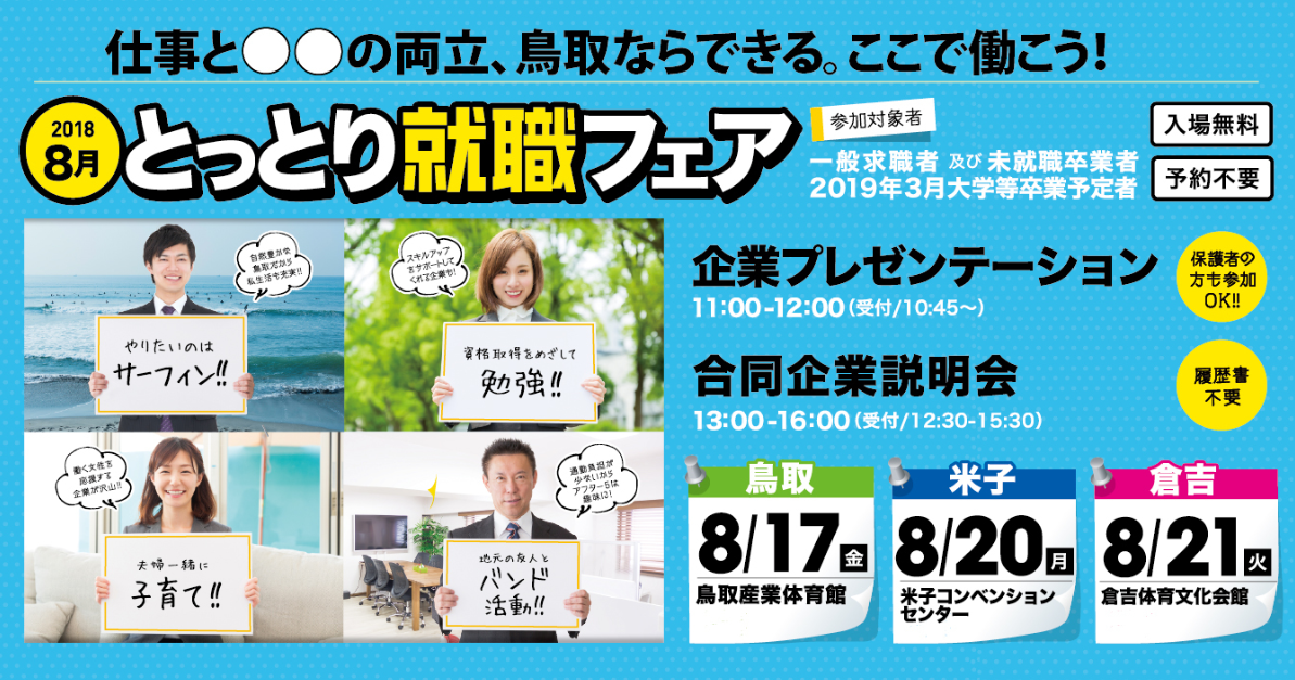 この度、鳥取就職フェア2018・8月 米子会場 合同企業説明会に