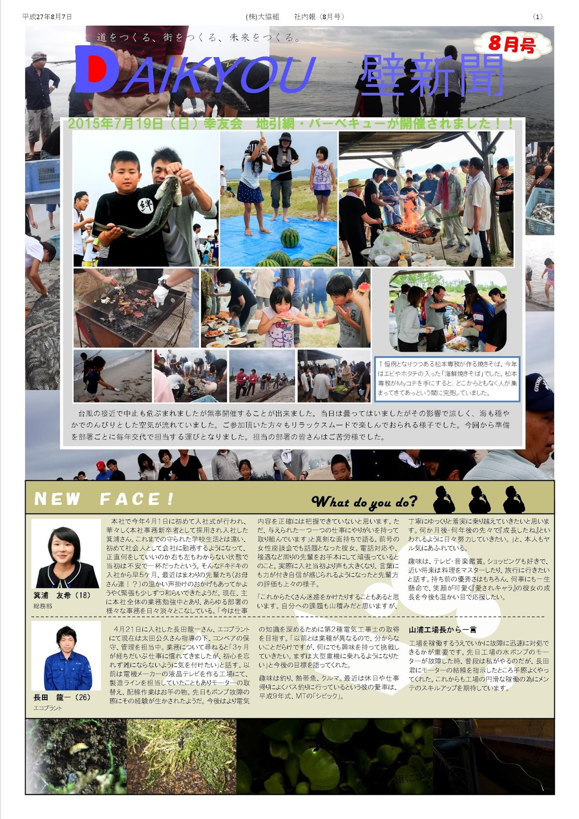 8月号Daikyou壁新聞発行!! 投稿日 2015年8月11日 daikyogumi@gmail.com 8月号『Daikyou壁新聞』が発行されました。 今回は、毎夏恒例の地引網・バーベキューや NEW FACEの紹介 各工事部門の活躍など 今号も内容盛りだくさんとなっています。 是非ご覧ください! 8月号主なTOPICS ・幸友会 地引網・バーベキュー大会 ・NEW FACE紹介 社内報編集委員会 (クリックすると拡大されます)