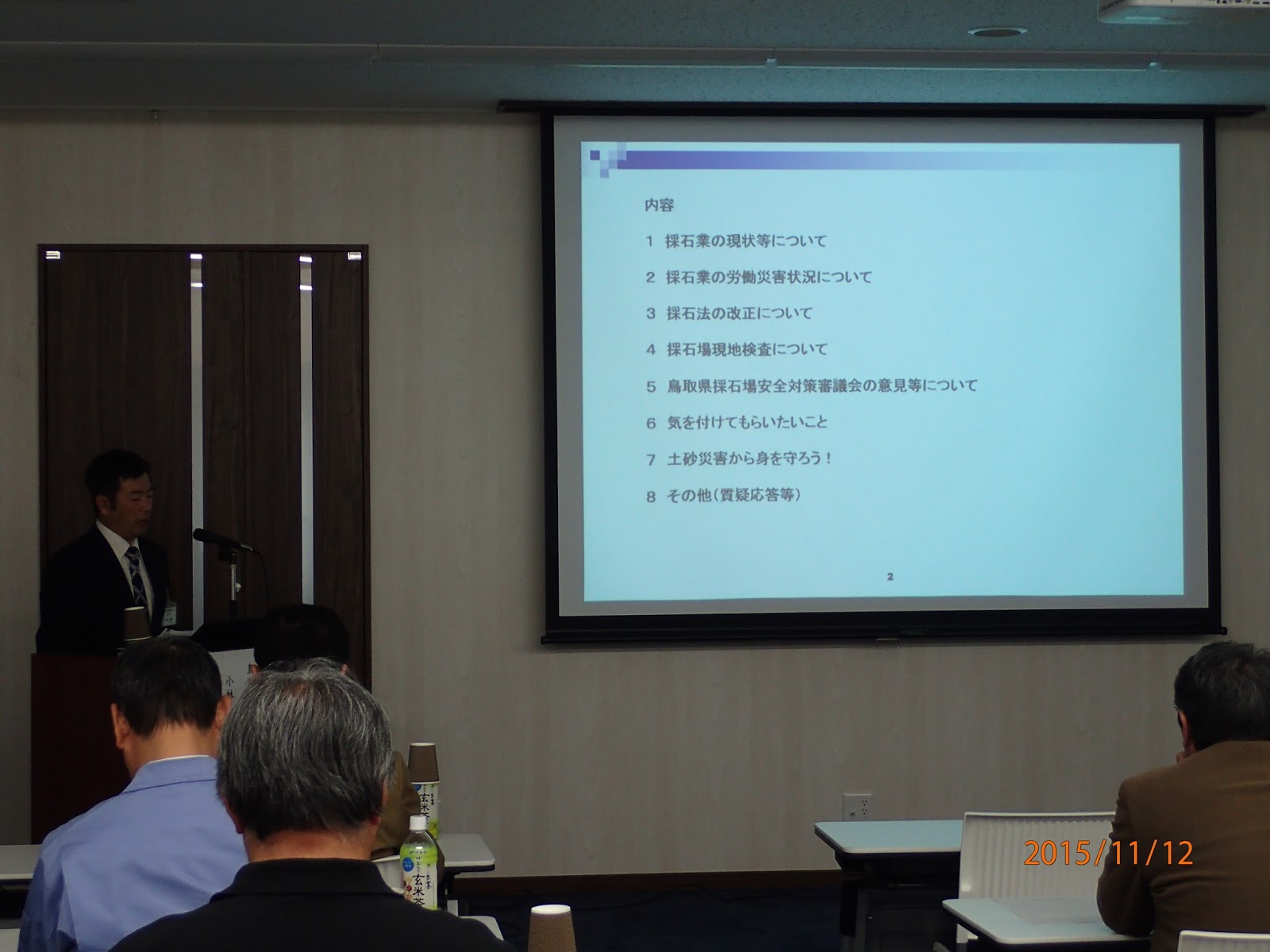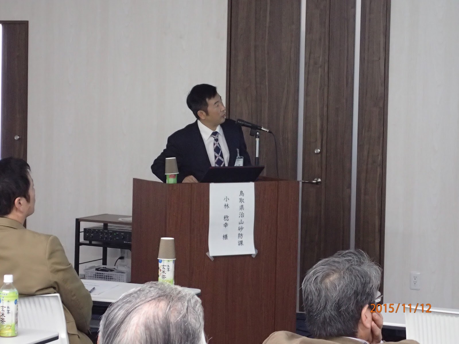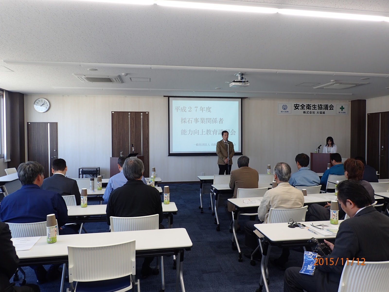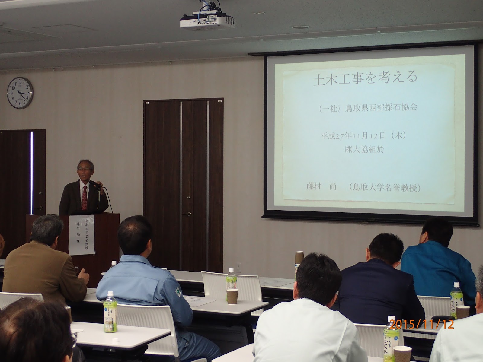平成27年度 採石事業関係者能力向上教育講習会 開催! 投稿日 2015年11月18日 daikyogumi@gmail.com 平成27年11月12日(金)、本社3F大会議室において、 一般社団法人鳥取県西部採石協会(小山典久会長)の 平成27年度採石事業関係者能力向上教育講習会が行われました。 講師として、鳥取県治山砂防課小林稔幸係長、 鳥取大学藤村尚名誉教授をお迎えし、採石事業の現状及び 今後の展望についてお話をいただきました。 会長挨拶(株式会社大協組 代表取締役 小山典久) 鳥取県治山砂防課 小林係長 鳥取大学 藤村尚 名誉教授