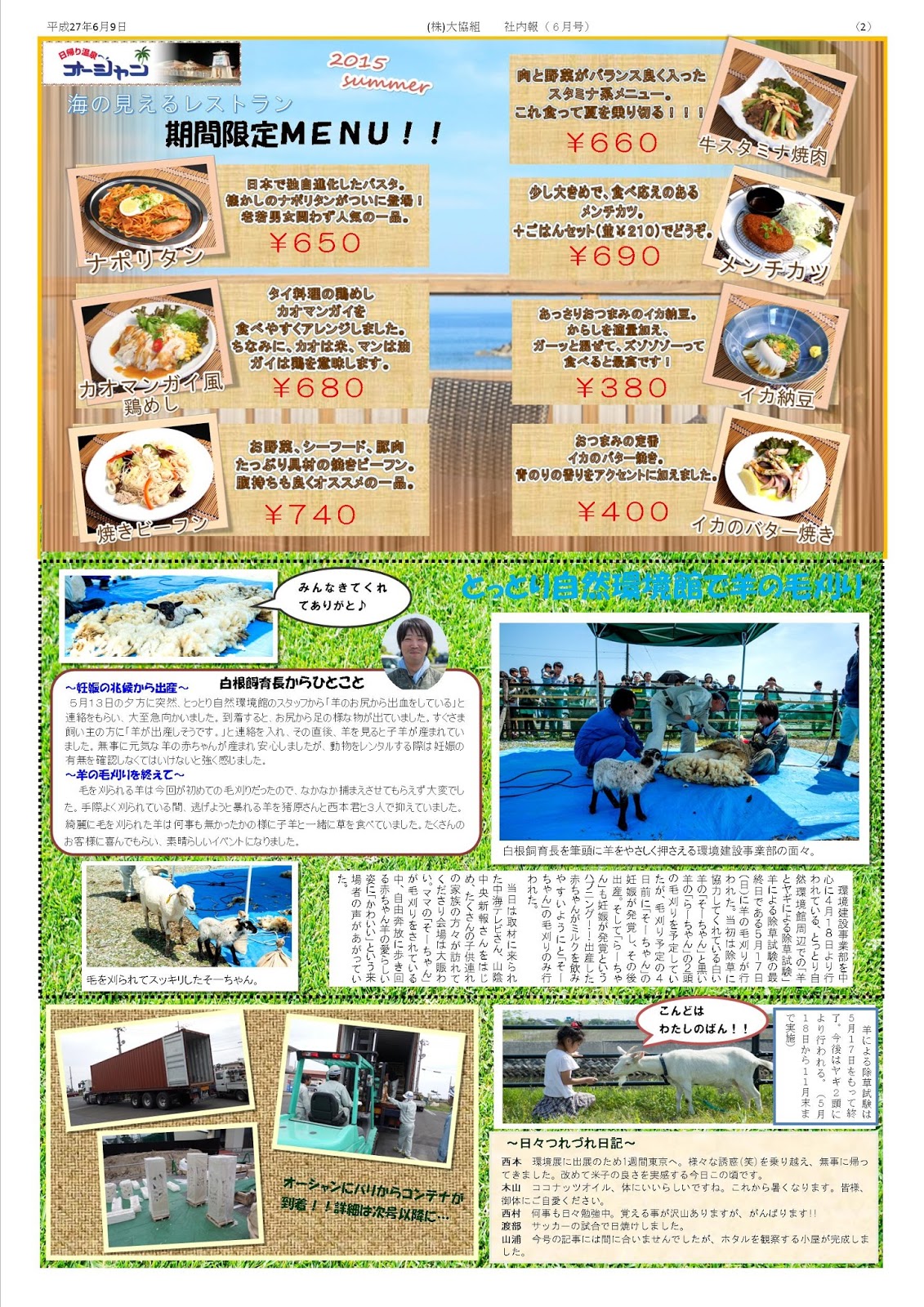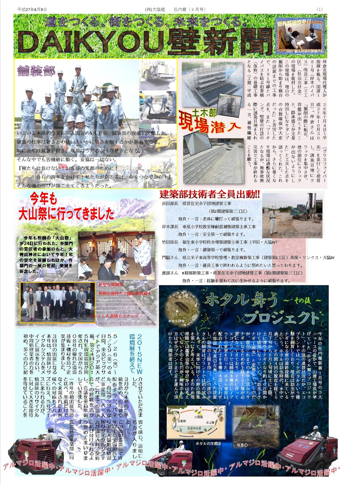 6月号Daikyou壁新聞発行!! 投稿日 2015年6月17日 daikyogumi@gmail.com 6月号の社内報『Daikyou壁新聞』が完成しました。 今月は爽やかな初夏のイメージの内容で大協組の活動をお伝えしています。 今後も、タイムリーで季節感ある紙面作りにスタッフ一同努めていきたいと思います。 6月号の主なTOPICS ・舗装部紹介 ・海の見えるレストラン 期間限定メニュー(夏) ・羊の毛刈り 社内報編集委員会 (画像をクリックすると拡大されます)